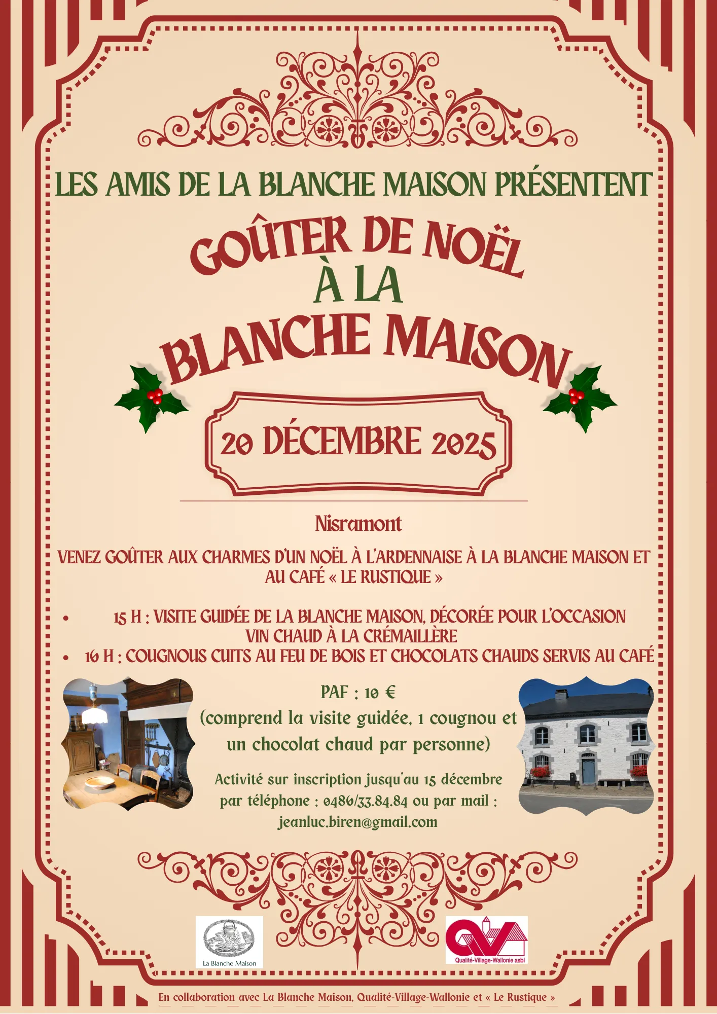 L'inscription s'effectue au plus tard le 15 décembre auprès de Jean-Luc Biren via son adresse électronique jeanluc.biren@gmail.com ou via son numéro de téléphone +32(0)486/33.84.84 (WhatsApp ou sms).