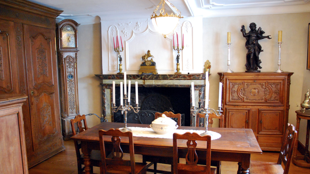 Ce qui frappe d’emblée, c’est la vaste cheminée de bois peinte en faux-marbre. Elle est surmontée d’un trumeau réalisé sans doute par le même stucateur que pour la console au dessus de la porte du «poêle». On y observe un décor d’inspiration Louis XIV comprenant des pampres et des merles aux yeux formés d’un éclat de charbon de bois (seul exemple repéré à ce jour).