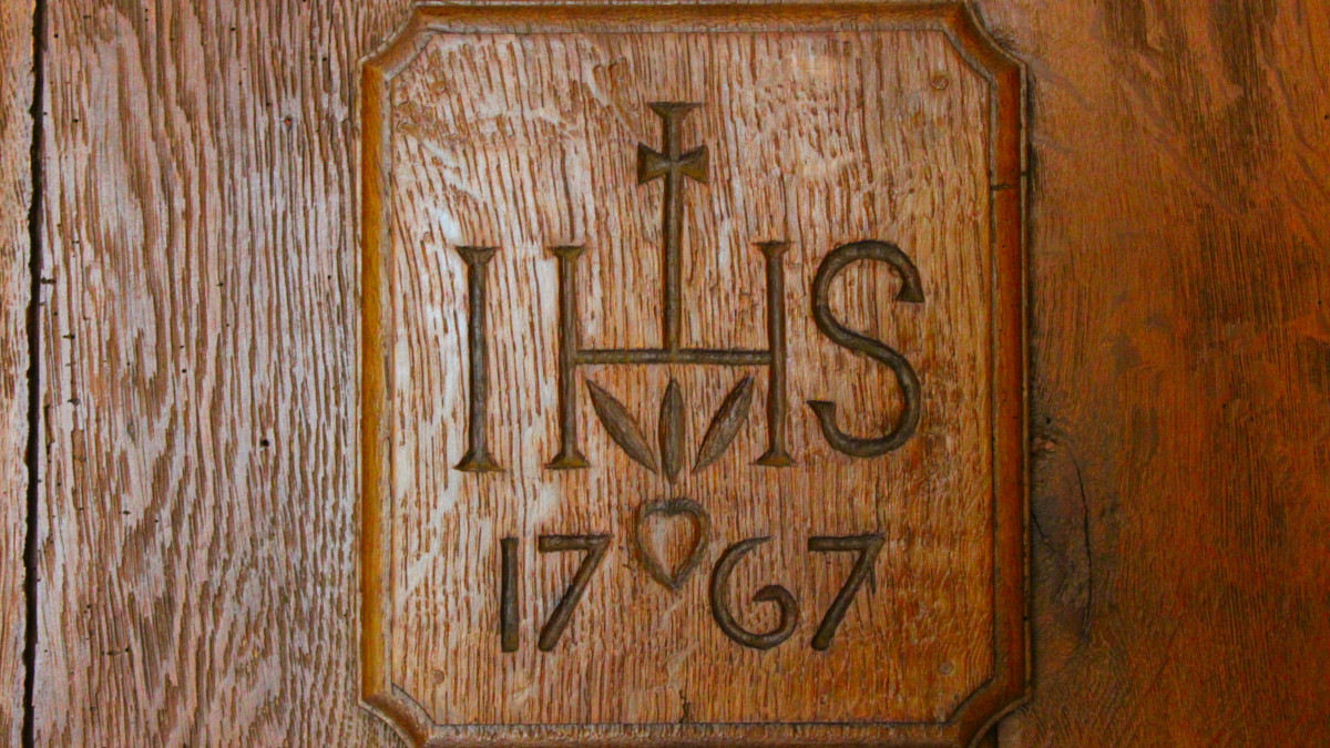 Au dessus de la porte de la cave, rappel de la date présumée d’achèvement de la maison (1767) surmontée du trigramme IHS1. Si cette plaque de chêne est récente, le signe protecteur qu'elle affiche se rencontrait fréquemment en Ardenne, notamment sur les linteaux des portes d'entrée. On retrouve un signe identique sur le socle d'un des poêles exposés dans la salle Saint-Hubert.