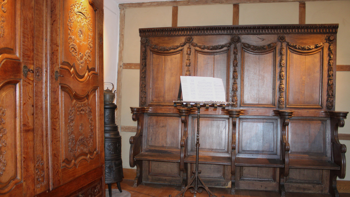 Juste au-dessus, entre deux chambres, subsiste une cloison similaire ayant conservé son torchis d'origine, appliqué sur des lattes de chêne fendu. Rappelons que durant des siècles, pratiquement toutes les maisons étaient entièrement construites de cette façon, leur "pétrification" n'ayant été réalisée que très progressivement durant les XVIIIe et XIXe siècles.