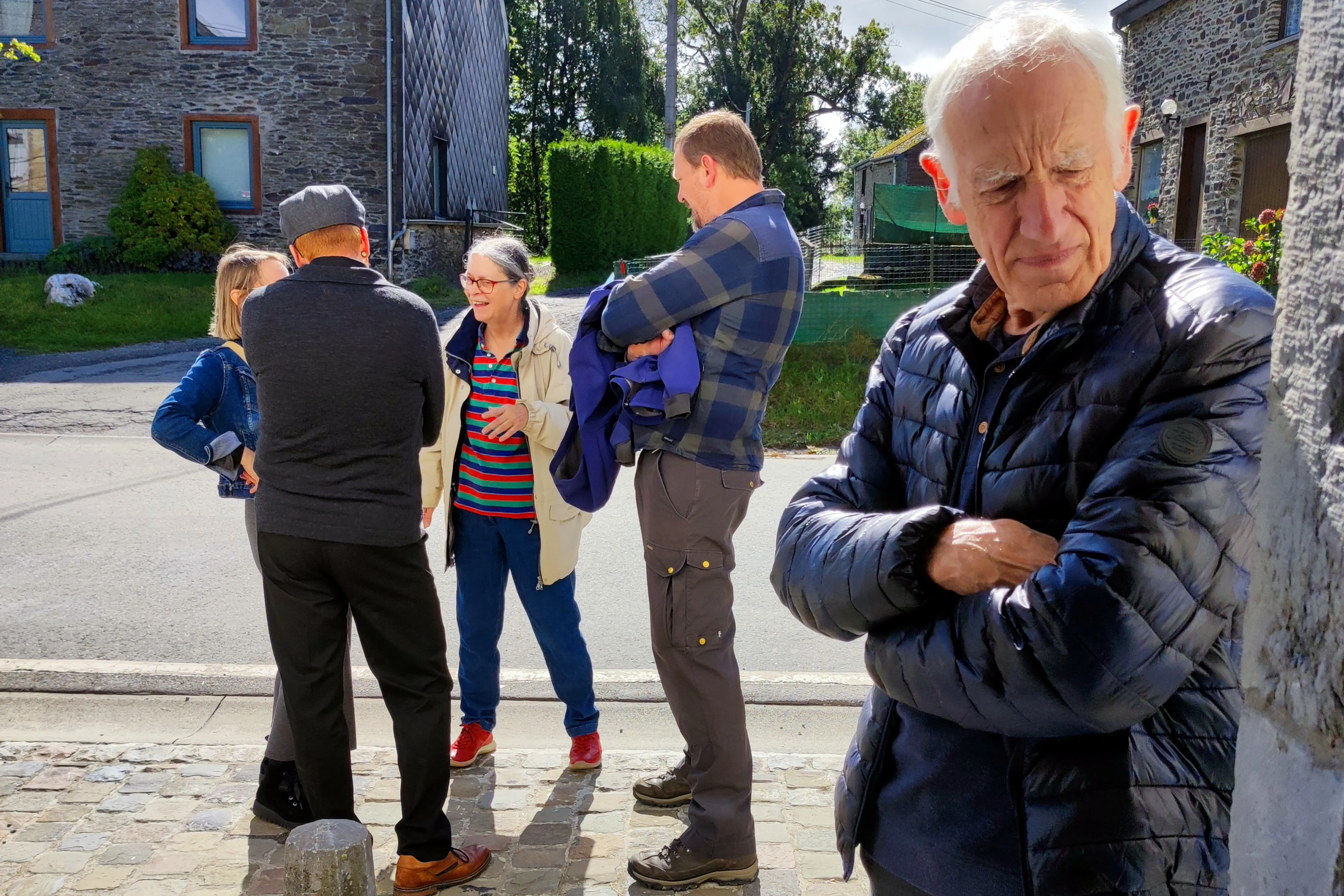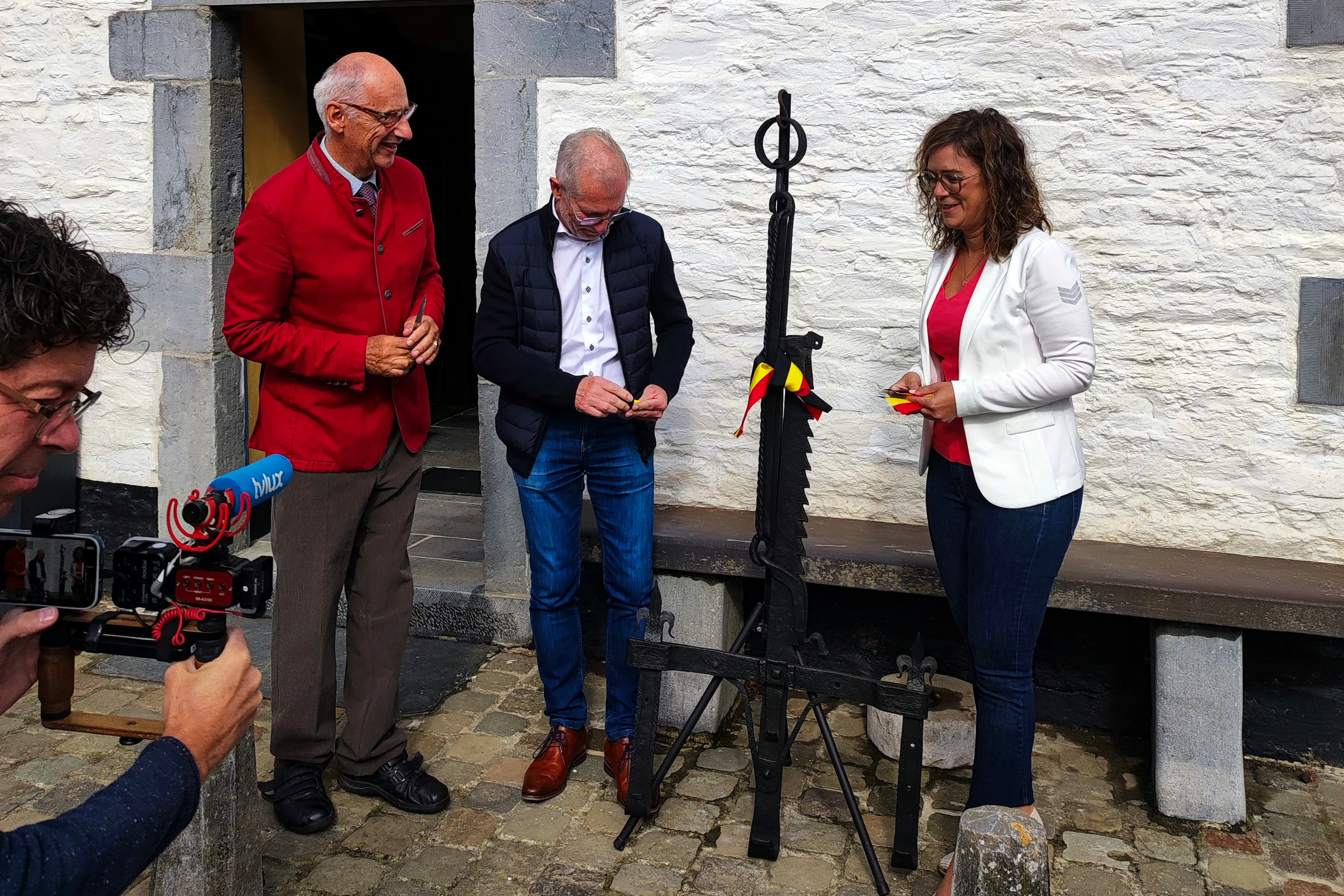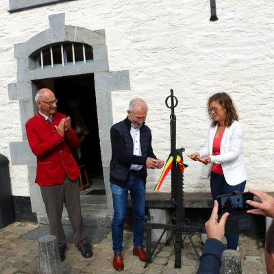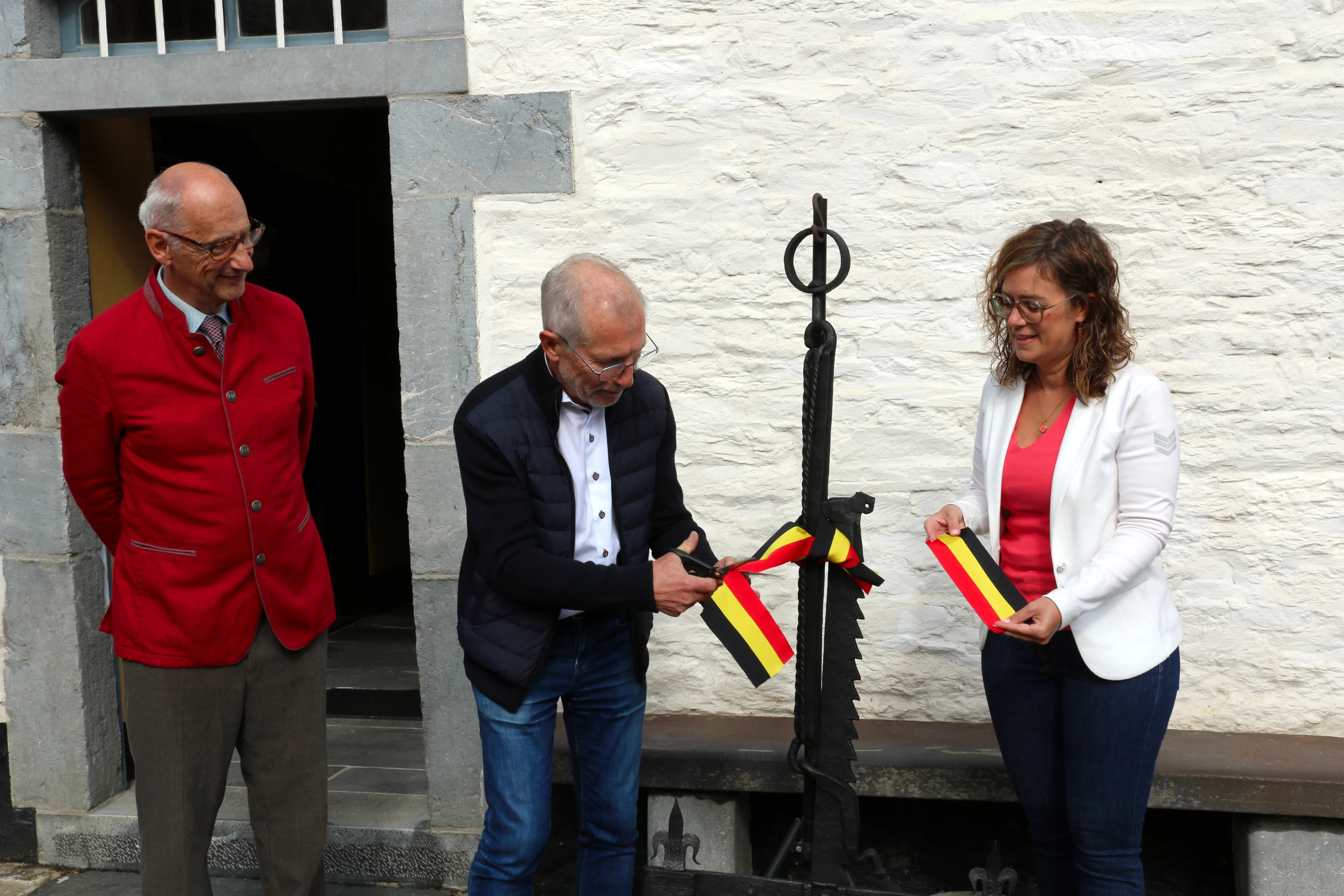En ce jour ensoleillé, tout avait été préparé pour recevoir les invités à l’inauguration officielle de la Blanche Maison. Une crémaillère ardennaise du XVIIe siècle, provenant de Regné (Vielsalm), attendait devant le seuil de la Blanche Maison. Enrubanné aux couleurs nationales, cet accessoire traditionnel des cuisines de jadis attendait de trouver sa place dans l’âtre. Deux personnalités allaient symboliquement libérer la crémaillère en coupant le ruban : Coralie Bonnet, Députée provinciale et Présidente du Collège provincial de la Province de Luxembourg, et Jean-Pierre Dardenne, Bourgmestre de la ville de La Roche-en-Ardenne.