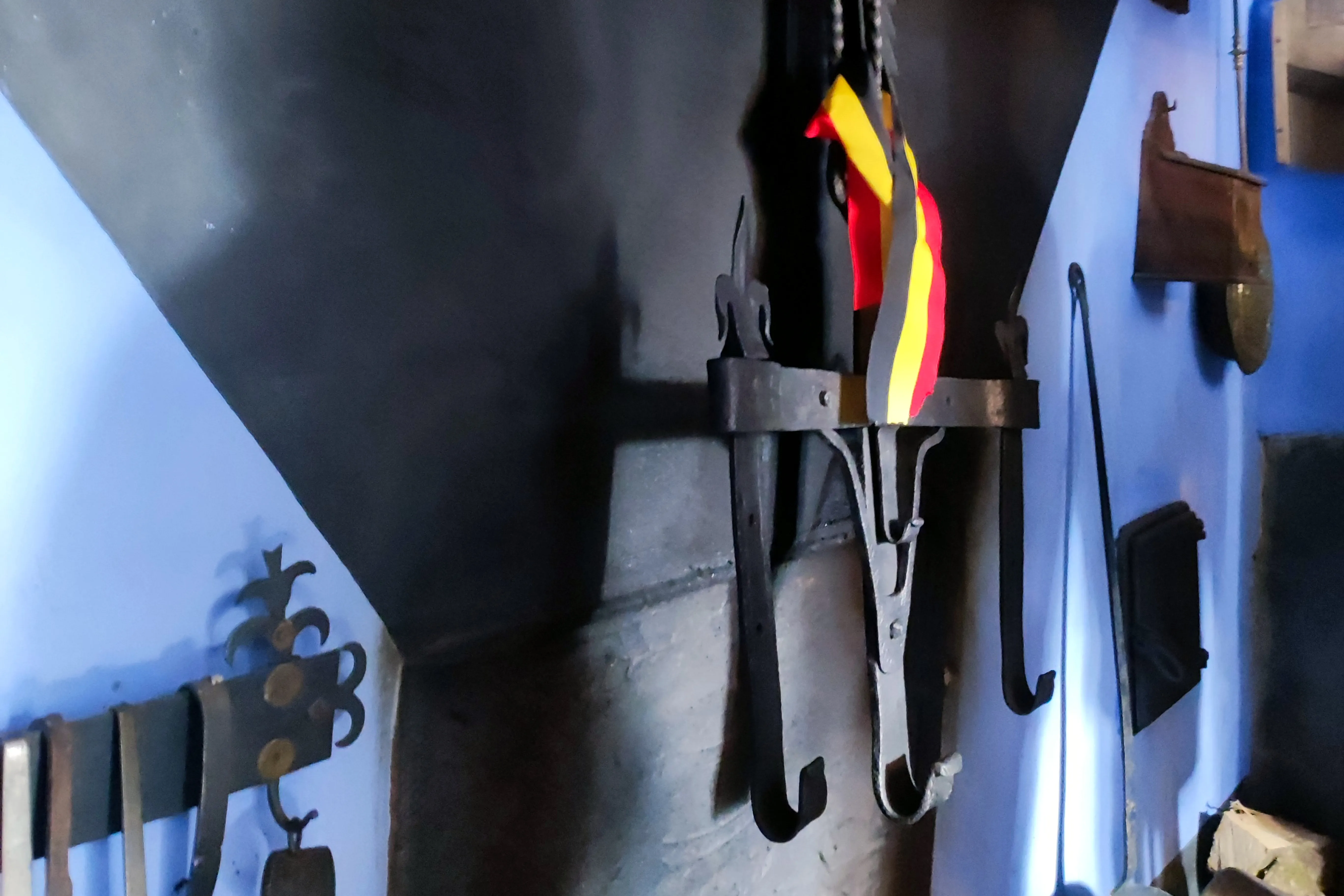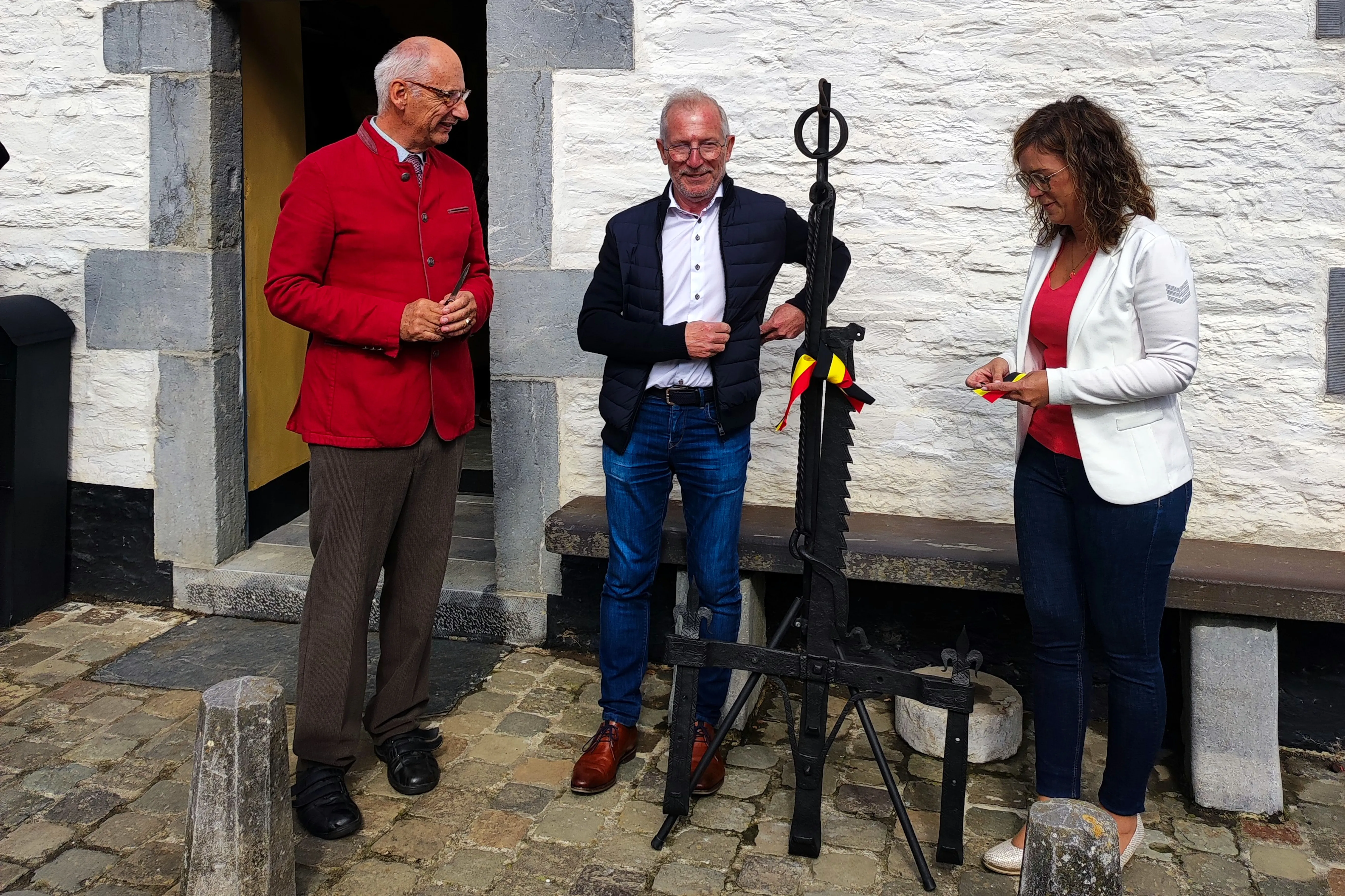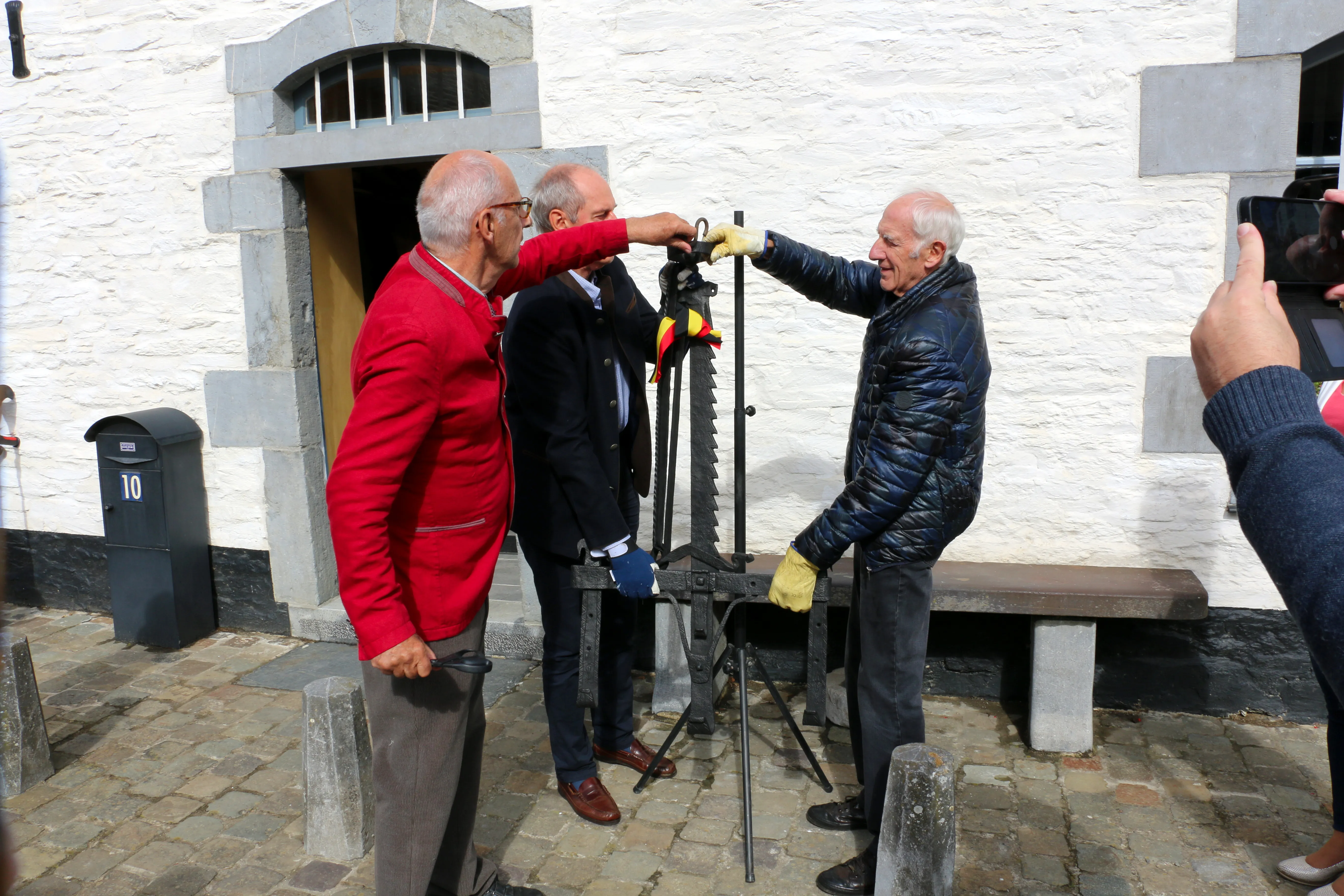 Emmanuel Rogman, Président de l’association Conseil de défense du château de Reinhardstein, et Jacques Wanlin, le menuisier-ébéniste qui a restauré les boiseries de la Blanche Maison, ont déplacé la crémaillère et l’ont accrochée dans la cheminée, concrétisant ainsi — à la lettre — une "pendaison de crémaillère".
