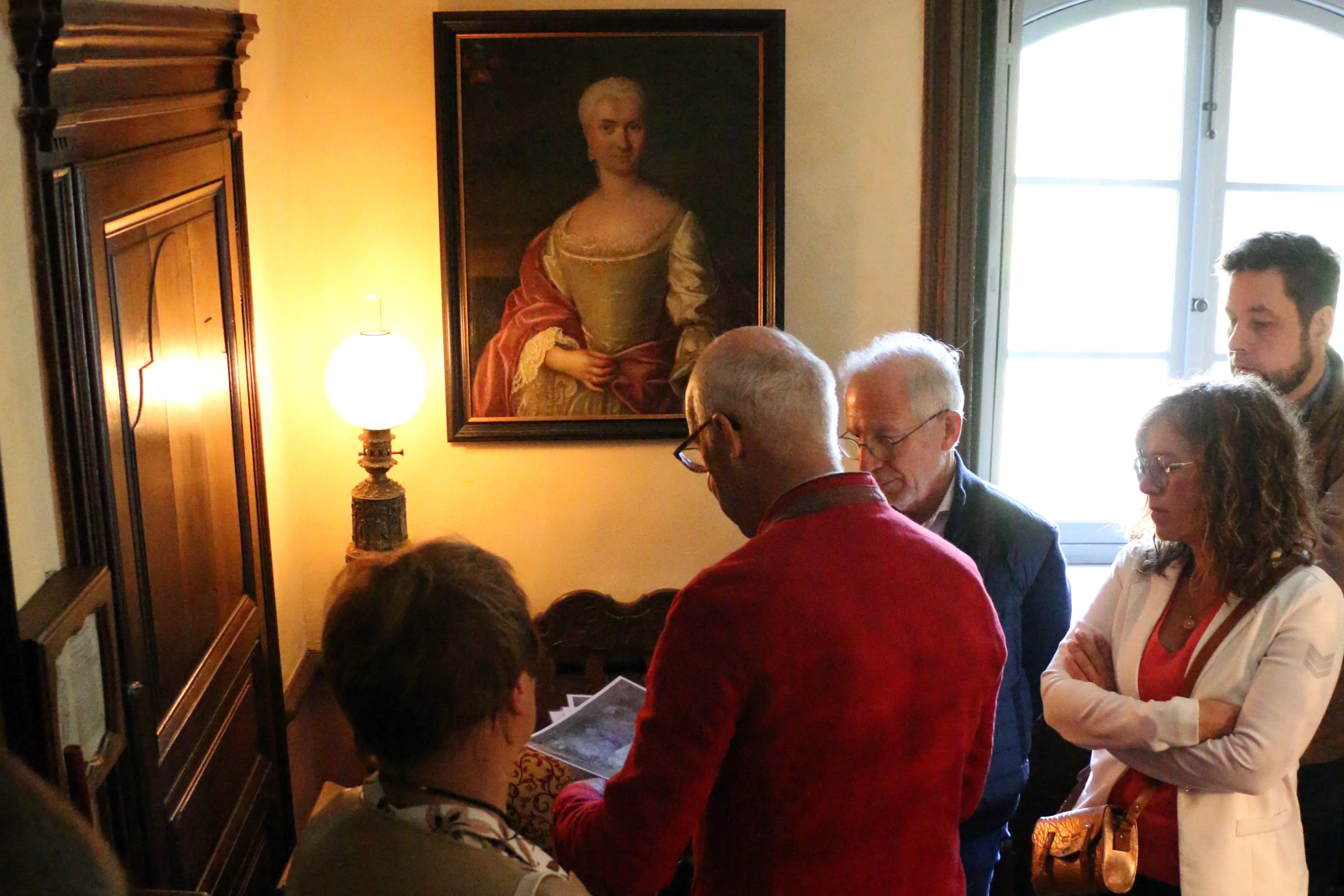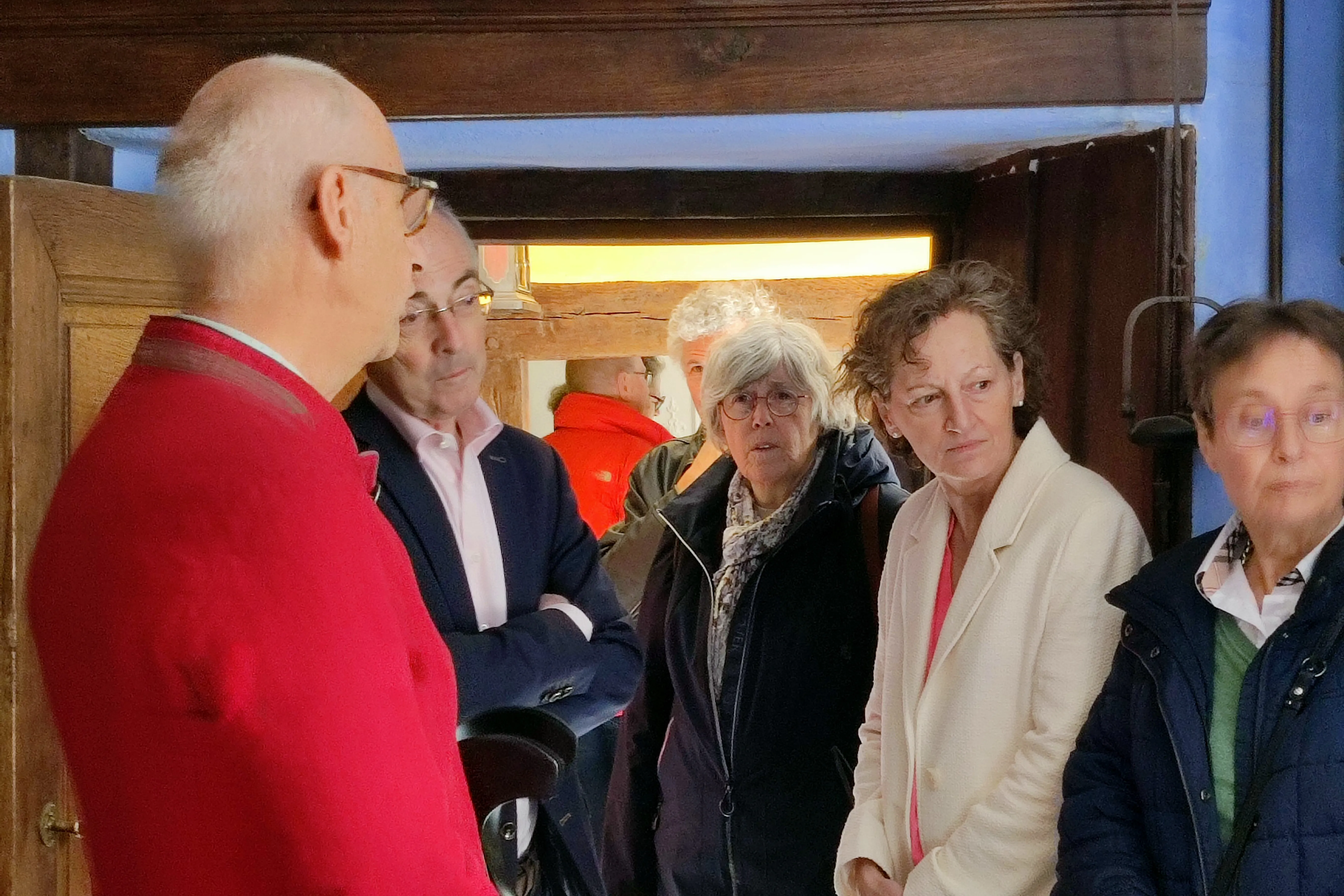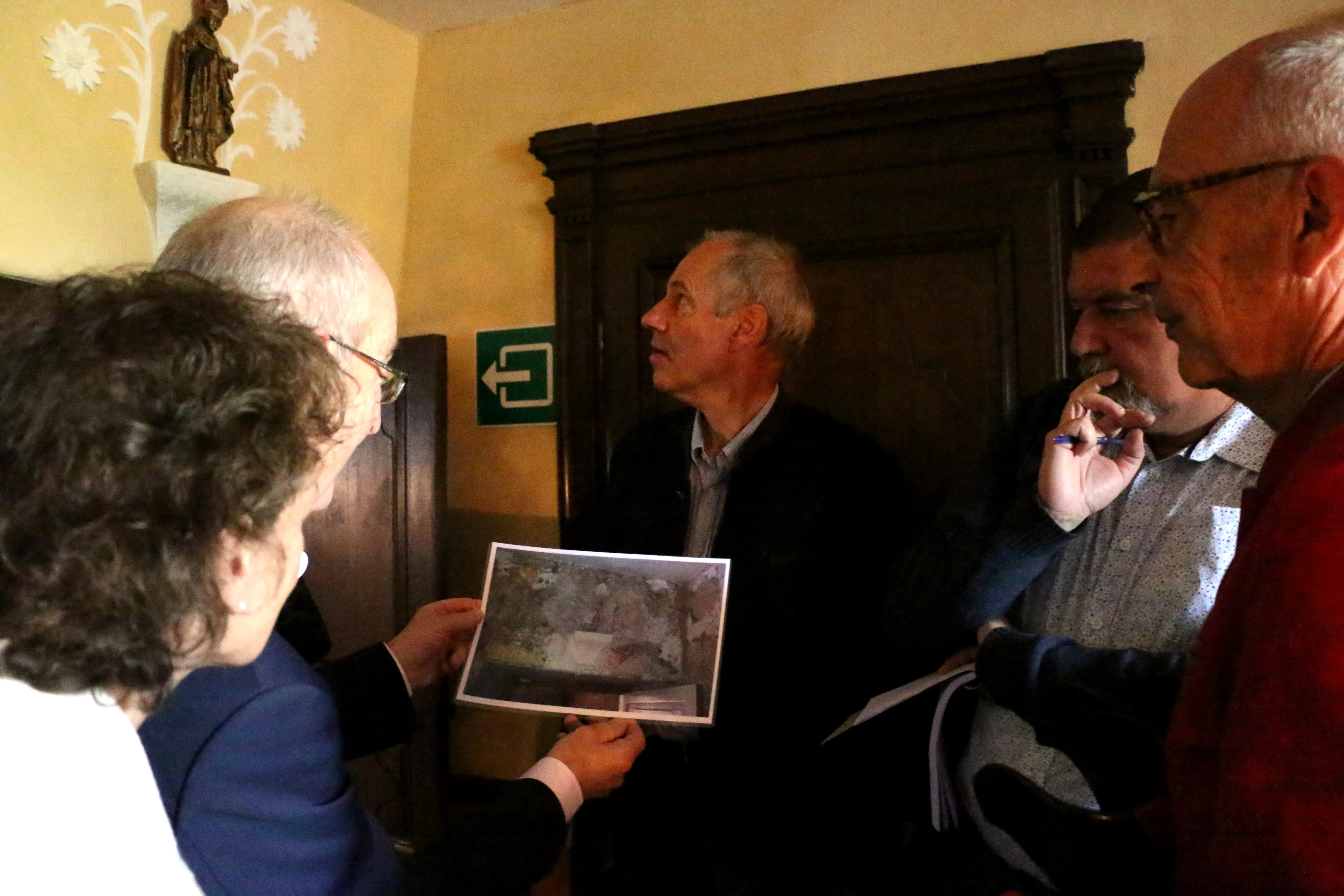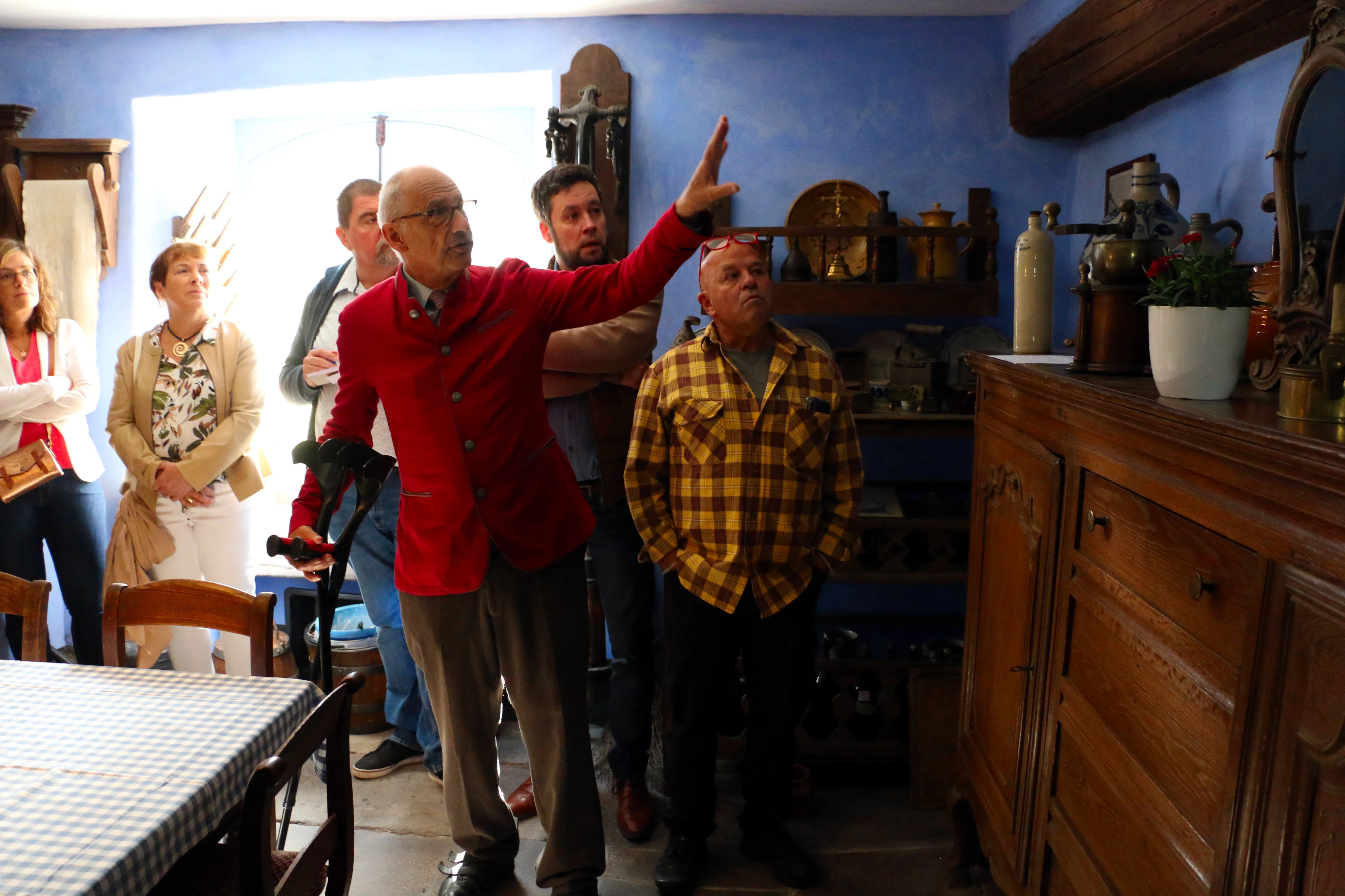 Cette cérémonie a été suivie de la visite des lieux, ouverts pour la première fois au public. L’assistance a ainsi découvert la cuisine avec ses murs chaulés en bleu outremer, une teinte traditionnelle car réputée chasser les mouches dans les croyances populaires. La visite s’est poursuivie dans la chambre derrière le feu, chaulée pour sa part en ocre jaune, teinte qui fait ressortir le délicat bouquet en stuc miraculeusement sauvé lors de la restauration. Il a été également question de stuc dans la belle salle avec le trumeau de la cheminée, lui aussi patiemment restauré : huit couches de peinture recouvraient les motifs décoratifs rarissimes qui font toute l’élégance de cette salle d’apparat. La visite du rez-de-chaussée s’est achevée dans la salle Saint-Hubert où ont été présentés les anciens menuisiers ardennais.